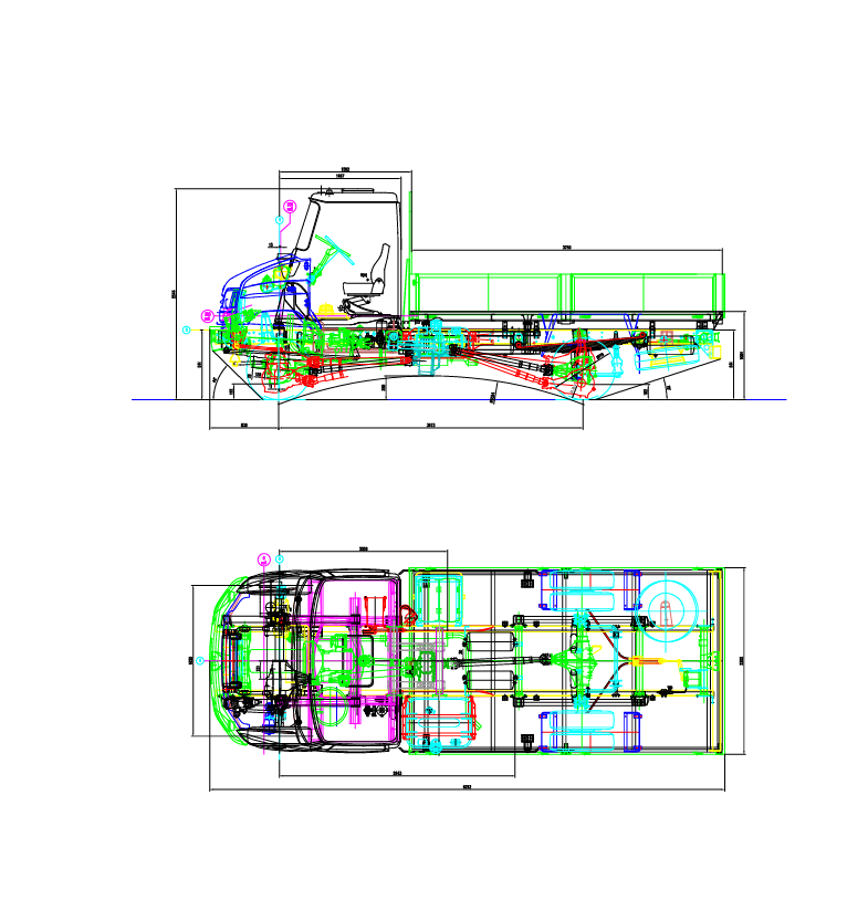 The 2D Iveco Truck CAD drawing is a detailed technical blueprint presenting a comprehensive vehicle chassis layout developed with precision engineering and accurate dimensional structure. Featuring both side and top views, this drawing provides a complete visualization of the truck’s structural geometry and mechanical integration.