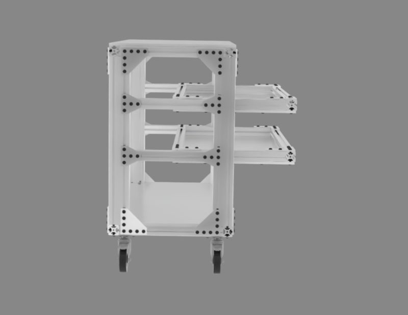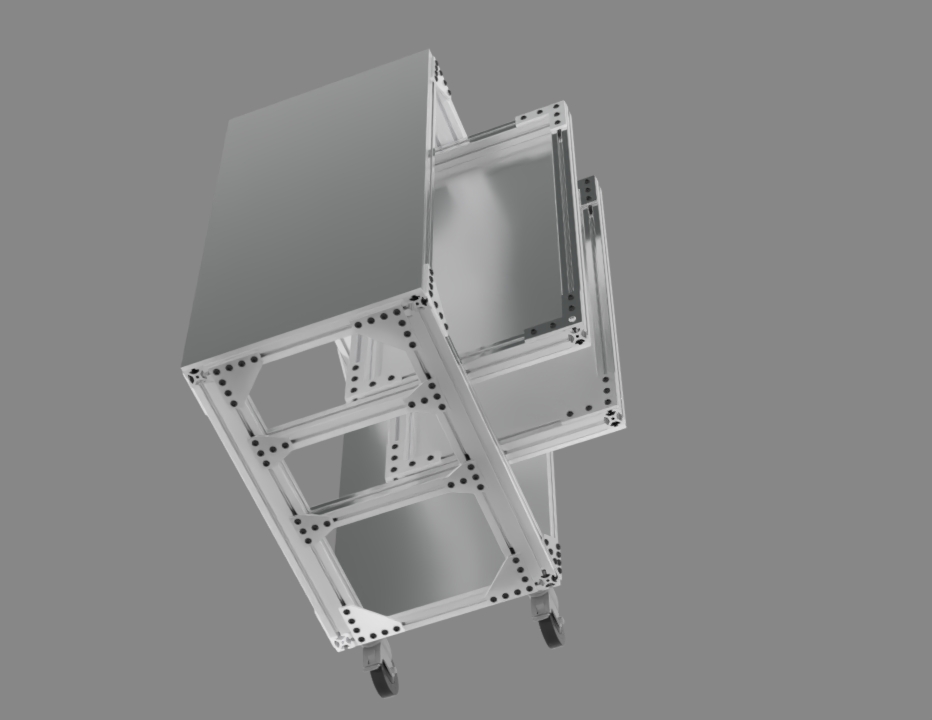 Realistic structure, including steel frame, work surface, and mobile wheel assembly